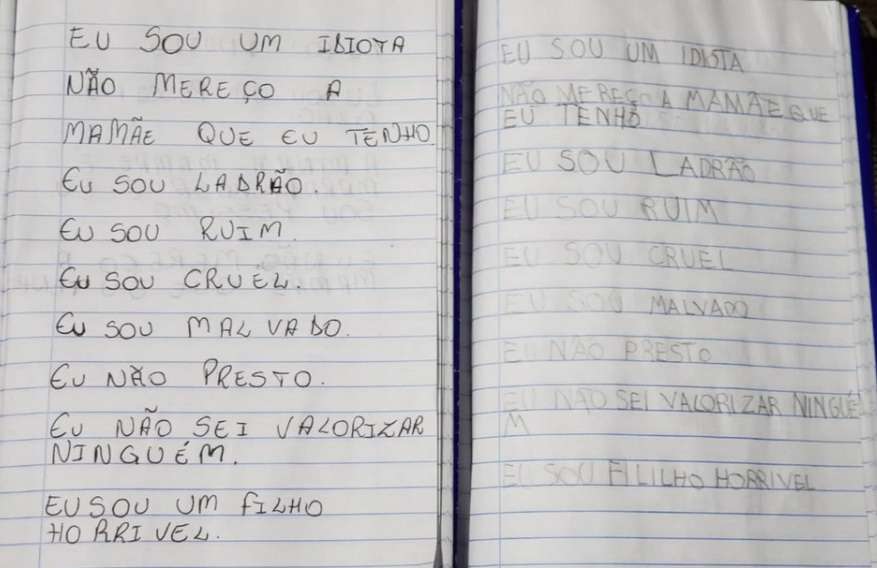 Em algumas das citações, o menino teve que reescrever que era “um idiota”, que “não merecia a mãe” que tinha” e que era “um filho horrível”.