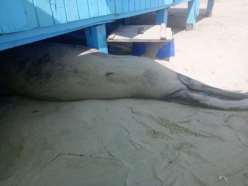 O elefante-marinho apresenta bom score corporal, está sem lesões e descansa tranquilamente à sombra de um quiosque. Especialistas explicam que a troca de pelagem é essencial para sua saúde, durante a qual os animais passam longos períodos em repouso.