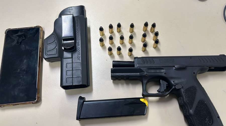 Durante averiguações no veículo, os policiais apreenderam uma pistola calibre .9 milímetros e 17 munições do mesmo calibre.