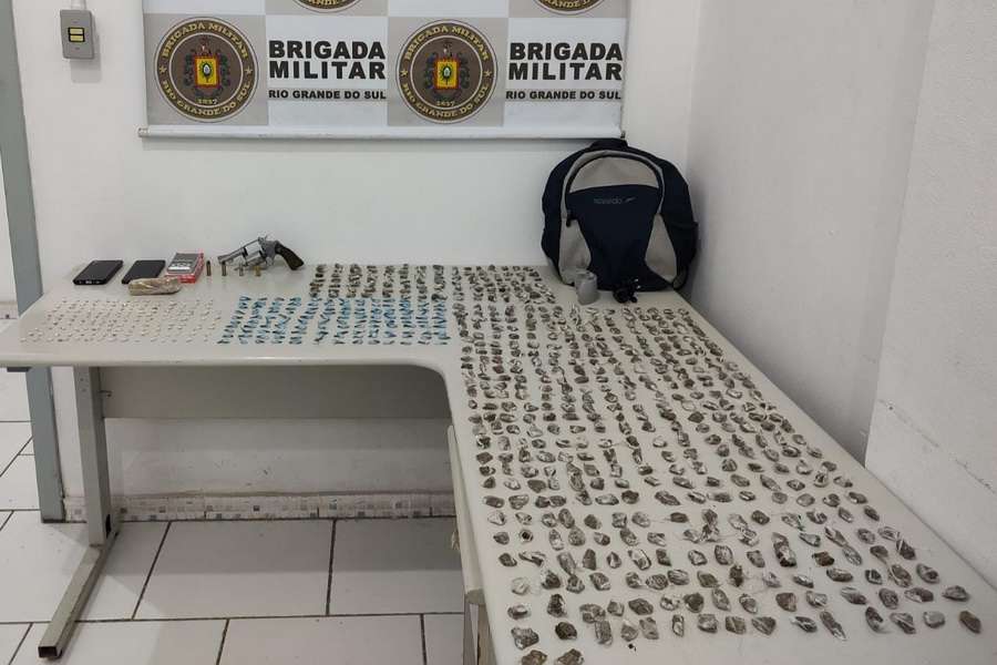 Realizada a abordagem foi localizado na cintura do adolescente, de 14 anos, um revólver calibre .38 com quatro munições e no interior da mochila apreendida com a mulher, de 27 anos, foram localizadas 774 porções de drogas, entre maconha, crack e cocaína, uma balança de precisão e dois celulares.