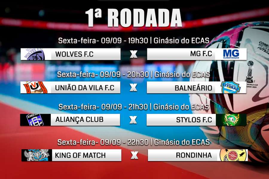 A primeira rodada do campeonato será disputada por WOLVES X MG FC, às 19h30; UNIÃO DA VILA X BALNEÁRIO, às 20h30; ALIANÇA X STYLOS, às 21h30 e KING OF MATCH X RONDINHA, às 22h30.