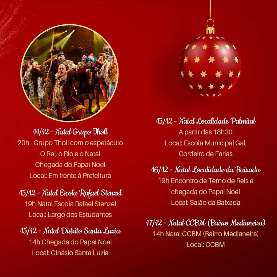 Durante a programação à população poderá conferir o show da Família Lima e do Grupo Tholl com o espetáculo O Rei, o Rio e o Natal.