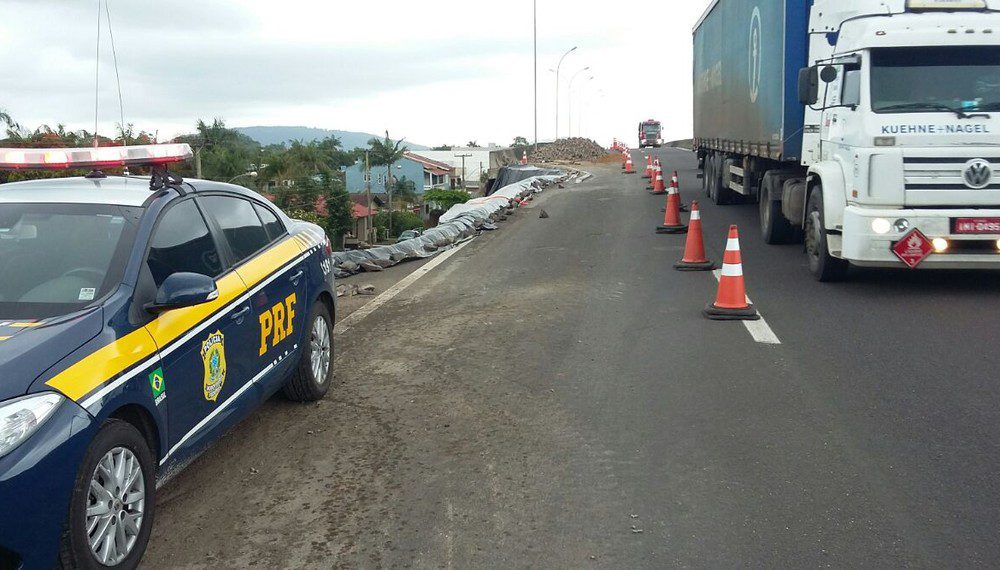 Obras no km 24 da BR-101 em Três Cachoeiras, no sentido Torres-Osório, provoca estreitamento de pista. O trabalho é realizado pelo Dnit no trecho, depois que o solo cedeu com o excesso de chuva.