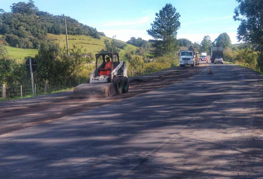 Nesta semana, as equipes de trabalho e os maquinários operam na pavimentação do acostamento da rodovia, entre os quilômetros 6 e 10.
