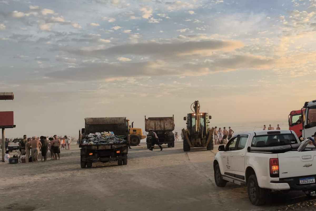 Operação de limpeza em Capão da Canoa mobilizou uma grande força-tarefa da Prefeitura na madrugada desta quarta-feira (1º) para remover o acúmulo de resíduos deixados após as comemorações de Réveillon.