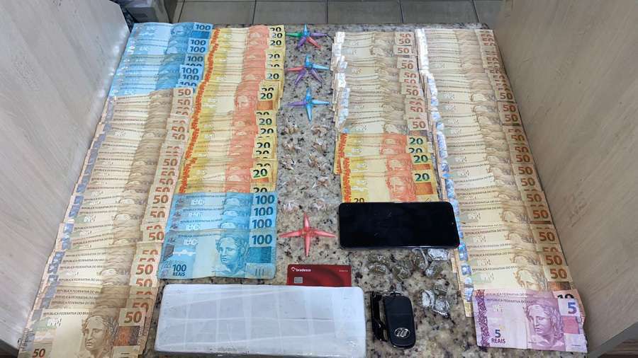 Com ele, foram localizadas aproximadamente 600 gramas de maconha, 14 porções de cocaína, 50 pedras de crack, um televisor sem procedência, um celular e R$ 7.515,00.