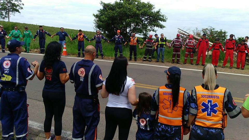 Equipes de emergência que participaram do resgate se reuniram no local do acidente e de mãos dadas fizeram uma oração.