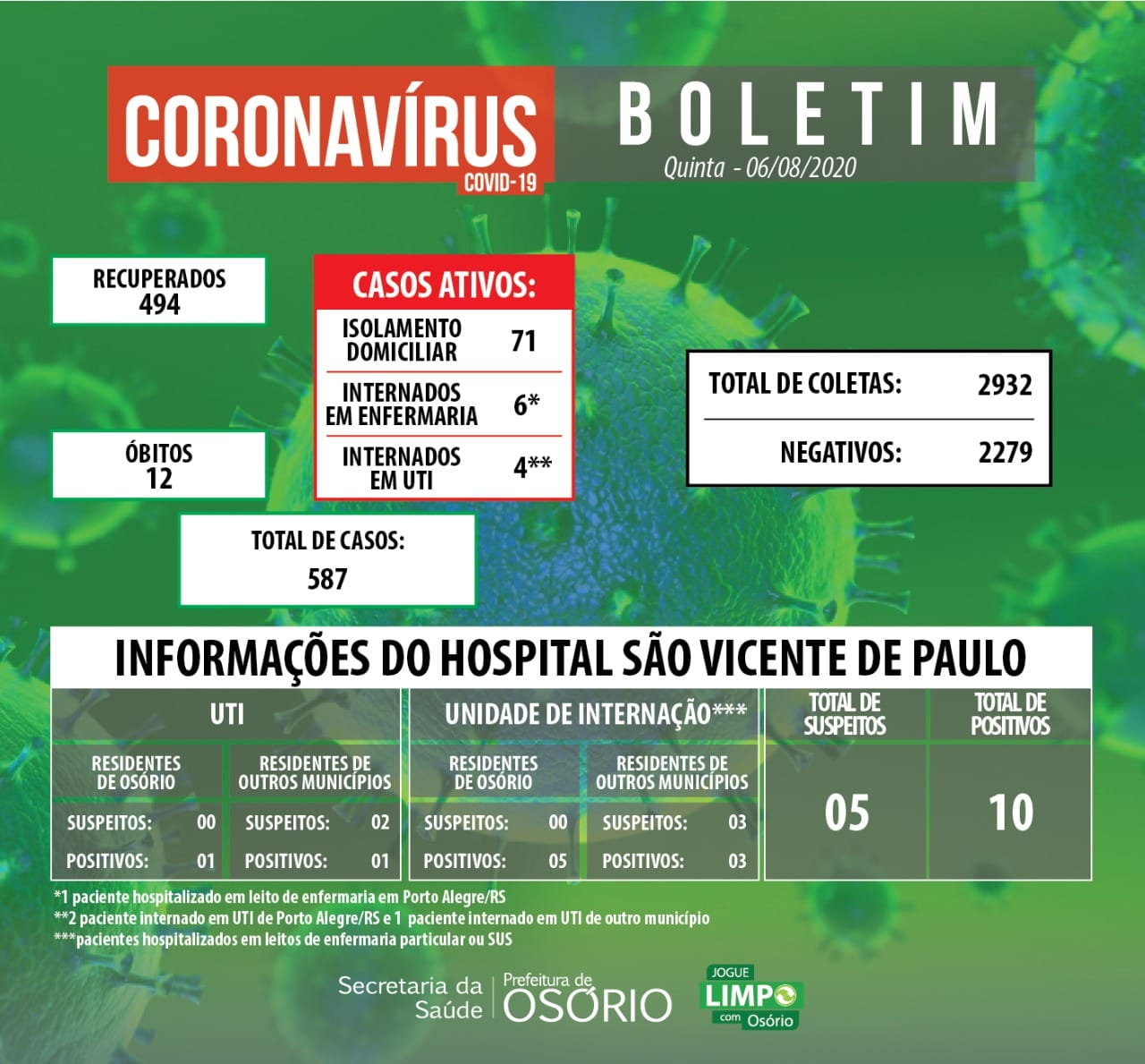 Confira os números referentes a pandemia da COVID 19, em Osório, nesta quinta-feira, 6/08/2020.
