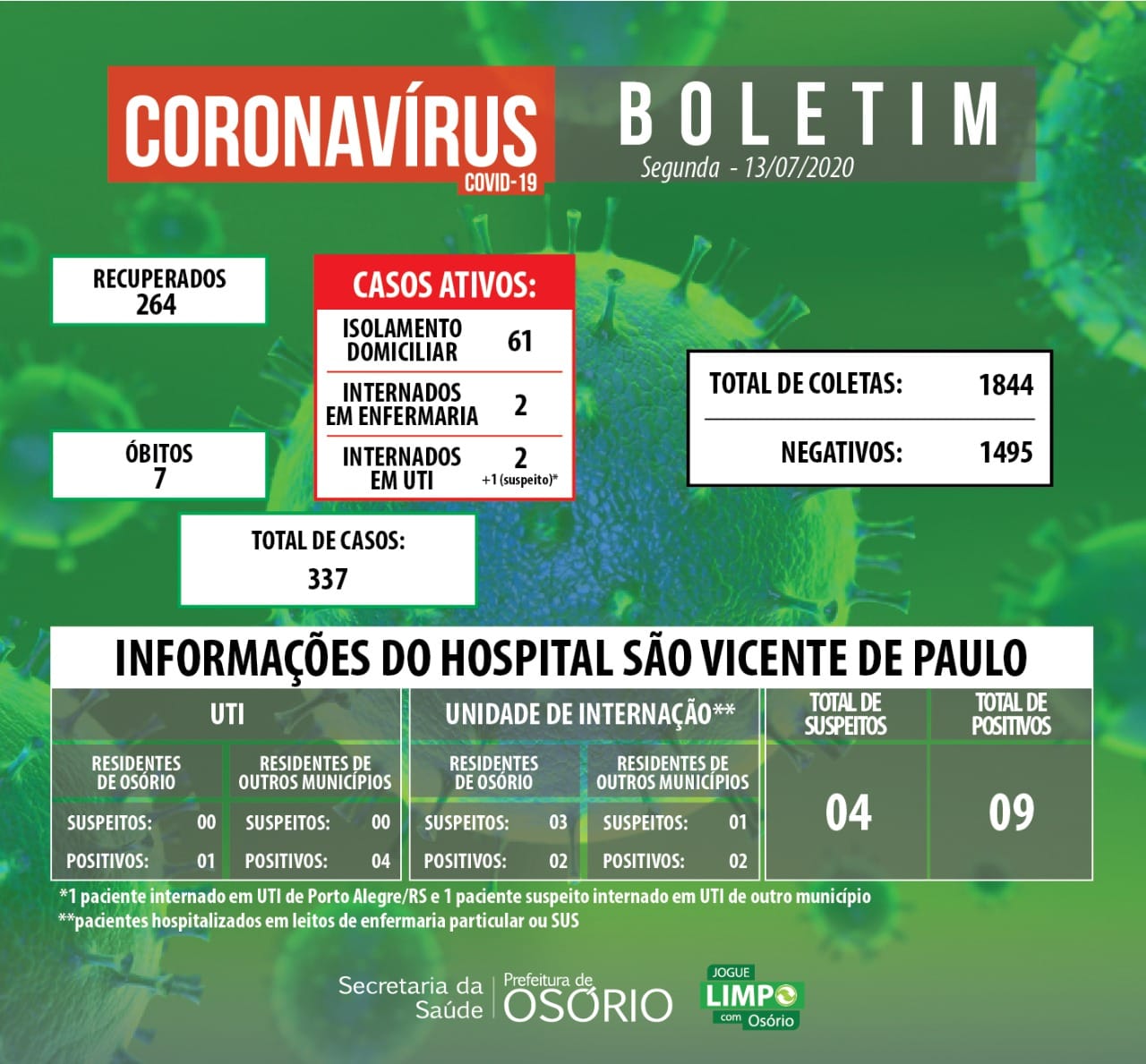 Confira os números referentes a pandemia da COVID 19, em Osório, nesta segunda-feira, 13/07/2020.