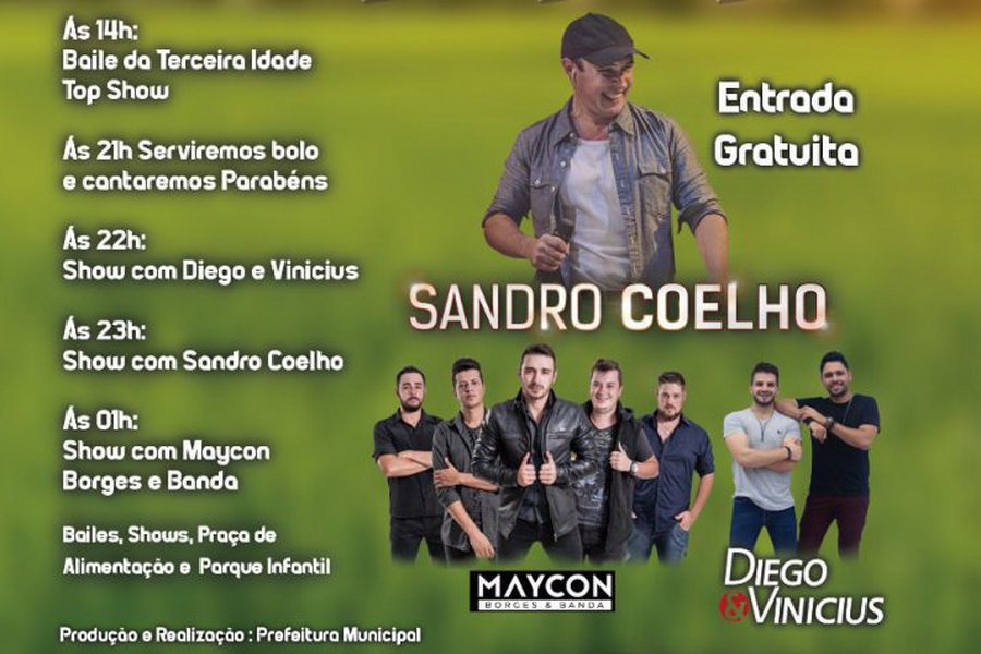 Baile da terceira idade, shows com Diego e Vinícius, Maicon Borges e Banda, além de sandro Coelho.