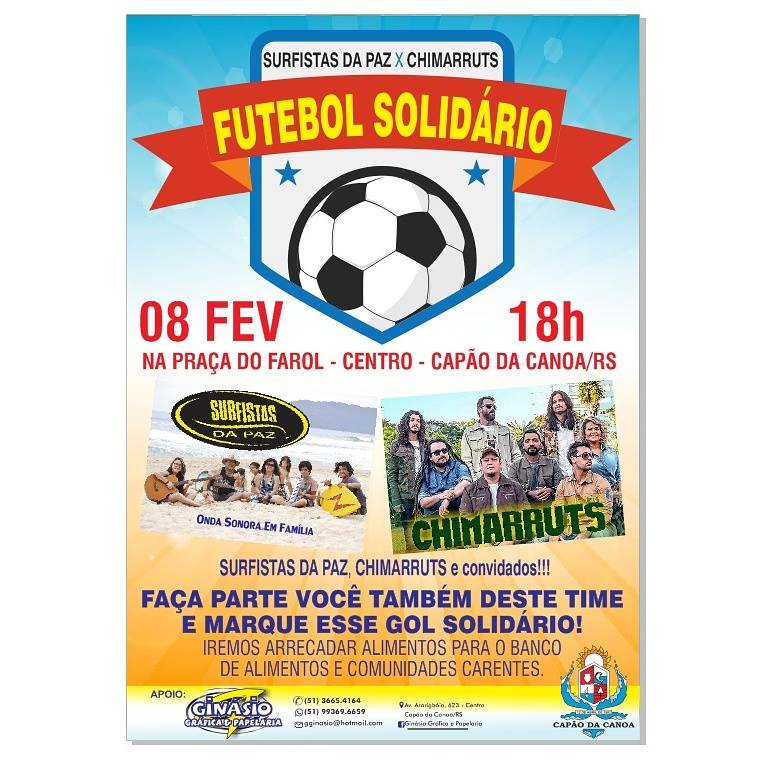16441662_1340583312630773_347372762_nConforme informação do Diretor do Departamento de Esportes, Carlos Alfranio Oliveira de Assis, no dia 8 de fevereiro, às 18h, na Praça do Farol, será realizada uma partida de futebol solidária, entre a banda caponense Surfistas da Paz, a banda Chimarruts e convidados.