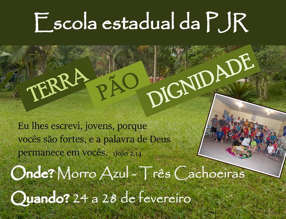 É com muita alegria que a Pastoral da Juventude Rural (PJR) convida os jovens e a todos que contribuem para que a juventude permaneça no meio rural, a conhecer a proposta da Pastoral da Juventude Rural e participar da Escola Estadual de Formação que acontecerá de 24 à 28 de fevereiro, na comunidade de Morro Azul, em Três Cachoeiras.