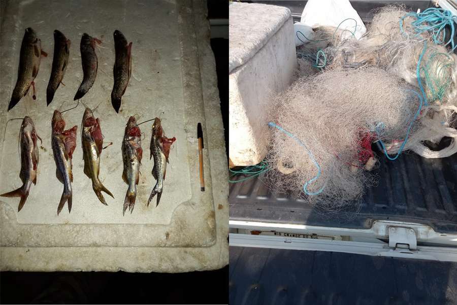Foram localizadas seis redes totalizando 120 metros, seis tarrafas e um espinhel com 20 anzóis sendo que os proprietários não possuíam carteira de pesca profissional e também por estar no período da piracema.