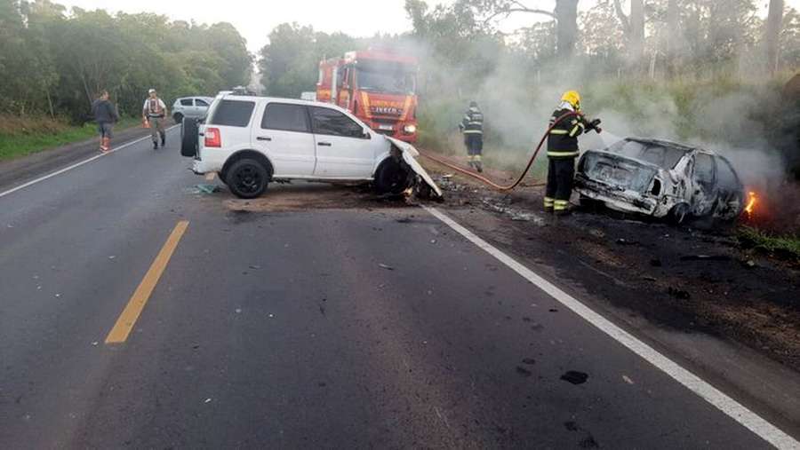 Houve uma colisão frontal que envolveu uma Ecosport, emplacada em Santo Antônio da Patrulha, e um Corsa, de Sapucaia do Sul e que acabou pegando fogo.