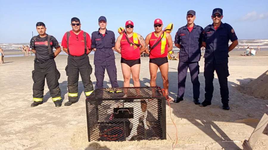 A viatura dos Bombeiros Voluntários de Balneário Pinhal se deslocou rapidamente, contando com dois socorristas, em colaboração com o CBMRS de Cidreira e os guarda-vidas da guarita 211, com o objetivo de realizar a captura do animal e tomar as medidas necessárias para assegurar a segurança da área.