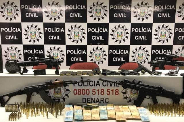 Na manhã desta sexta-feira (28) a Polícia Civil, por meio da Divisão de Inteligência e Análise Criminal (Dipac/Denarc), deflagrou a Operação Pulso Firme no combate ao crime de lavagem de dinheiro relacionado ao tráfico de drogas. Foram cumpridas 156 ordens judiciais em Porto Alegre, Canoas, Cachoeirinha, Gravataí, Novo Hamburgo, Tramandaí, Imbé, Cidreira e Palmares do Sul. Ao total, quatro pessoas foram presas em flagrante, duas temporariamente e 10 foram conduzidas coercitivamente. Dois fuzis, três pistolas, uma carabina .22, silenciadores de fuzil, dois revólveres, mira laser, munições de diversos calibres, jóias e mais de duzentos mil Reais em dinheiro.