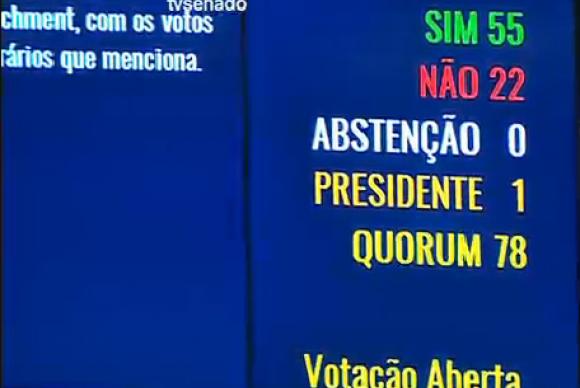 O Senado aprovou, por 55 votos a favor e 22 contra, a admissibilidade do processo de impeachment da presidenta Dilma Rousseff. Com isso, o processo será aberto no Senado e Dilma será afastada do cargo por até 180 dias, a partir da notificação. Os senadores votaram no painel eletrônico. Não houve abstenções. Estavam presentes 78 parlamentares, mas 77 votaram, já que o presidente da Casa, Renan Calheiros, se absteve.