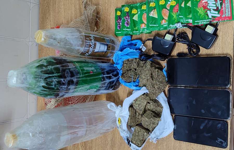Dentro das embalagens havia várias porções de maconha (515 gramas), dois carregadores de celular, três aparelhos celulares, três garrafas de cachaça e 10 pacotes de suco.
