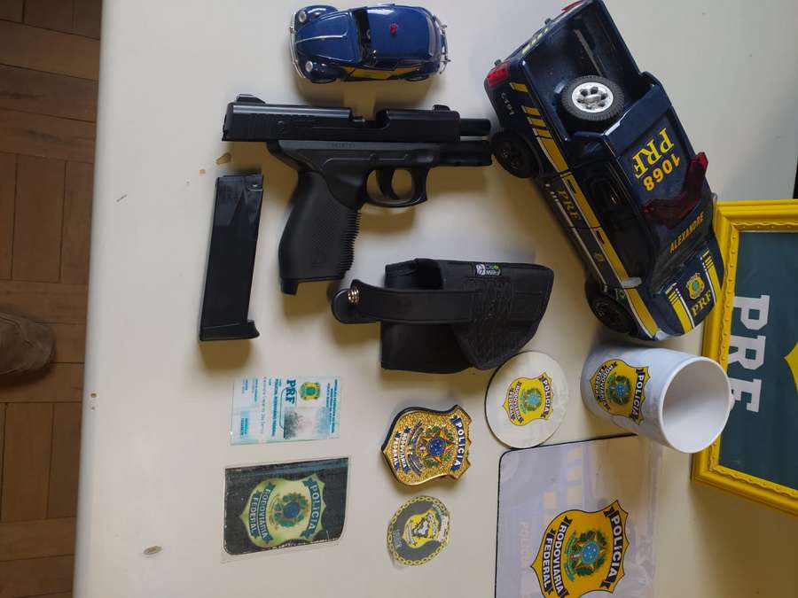 Durante o cumprimento, os policiais encontraram um cartão de identidade funcional falso da PRF com os dados de identificação do suspeito, um simulacro de arma de fogo, um distintivo e outros itens com a identificação da corporação.