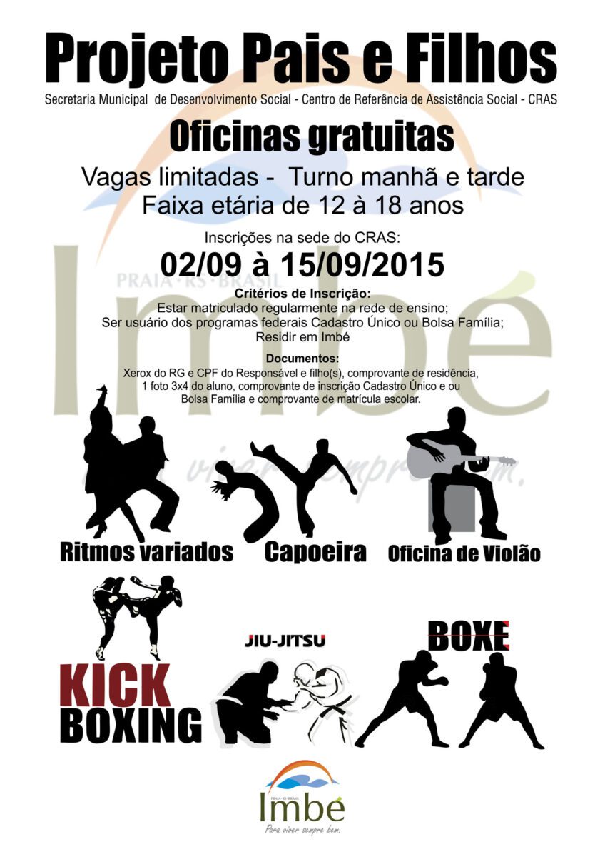 Projeto Pais e filhosEstão abertas até o dia 15 deste mês as inscrições para o projeto “Pais e Filhos”, iniciativa da Prefeitura de Imbé, através da Secretaria Municipal de Desenvolvimento Social. Conforme o secretário Edison Luiz Rosa de Quadros, o Edinho, a iniciativa consiste em oficinas voltadas aos jovens com idade entre 12 e 18 anos e ocorrem no turno inverso às aulas. Serão oferecidas atividades como jiu jitsu, kick boxing, violão, capoeira e ritmos variados.