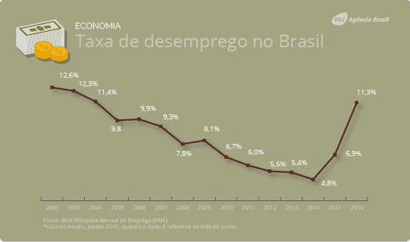 Uma das principais bandeiras do governo Dilma, o pleno emprego, acabou se tornando um problema crucial para a gestão petista no final de seu mandato. O índice de desemprego, que chegou a atingir 4,8% em 2014, voltou aos níveis encontrados no início do mandato PT (12,3%, em 2003). A equipe econômica de Dilma Rousseff chegou a adotar medidas para evitar que a crise chegasse ao mercado de trabalhado Apesar dos esforços, em julho deste ano, a taxa de desemprego alcançou 11,6%, atingindo 11,8 milhões de pessoas.