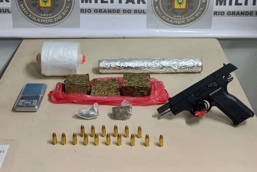 Além da pistola calibre 9mm com 16 munições, foi localizada uma sacola contendo porções de maconha (totalizando mais de 400g), balança de precisão.