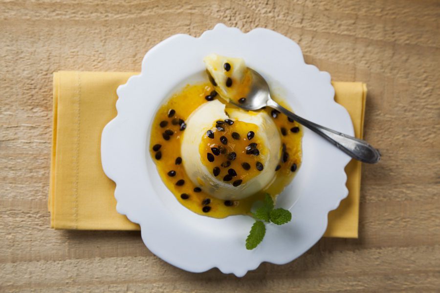 - Desenforme a panna cotta em um prato e regue com a calda de maracujá.