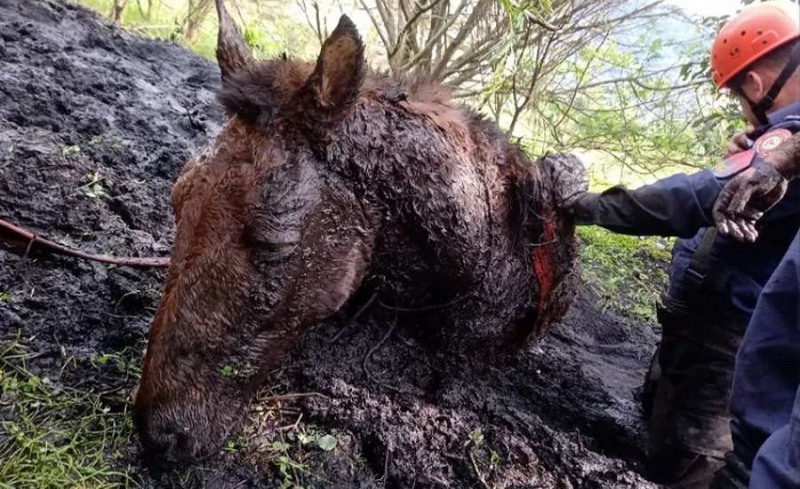 Para não machucar o animal foram realizadas escavações com uma pá, para tirar o máximo possível de lodo que encobria grande parte do corpo do equino.