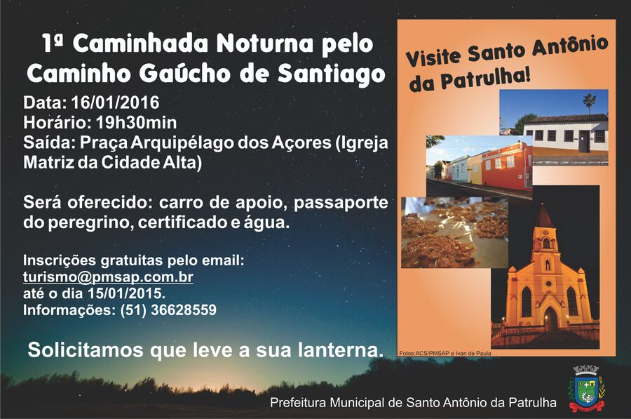 A Secretaria Municipal de Cultura, Turismo e Esportes promove no sábado, 16 de janeiro, a primeira Caminhada Noturna no Caminho Gaúcho de Santiago, às 19h30min, em Santo Antônio da Patrulha.