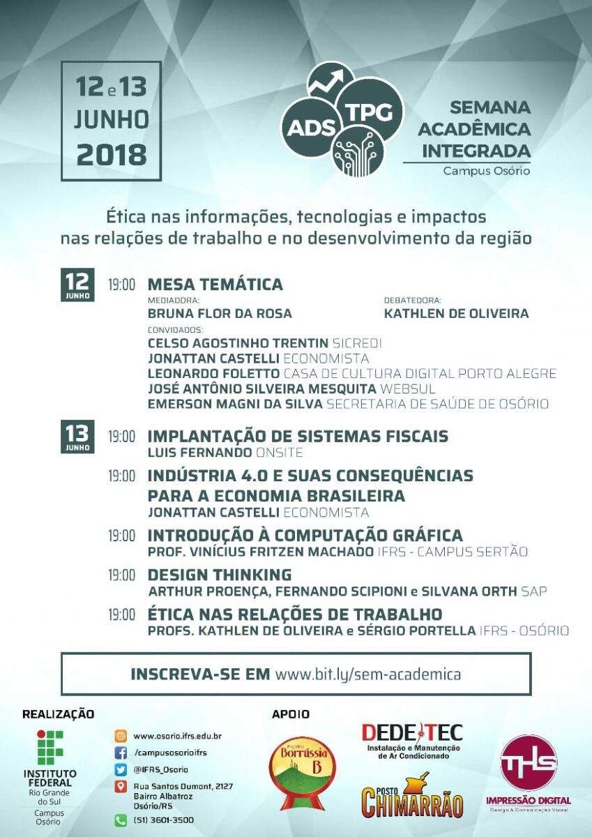 Semana Acadêmica Integrada entre os cursos Análise e Desenvolvimento de Sistemas (ADS) e Tecnologia em Processos Gerenciais (TPG), acontece a partir das 19h, nos dias 12 e 13 de junho, no Instituto Federal, campus Osório.