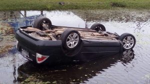 Motorista perde controle e capota carro às margens da Estrada do Mar