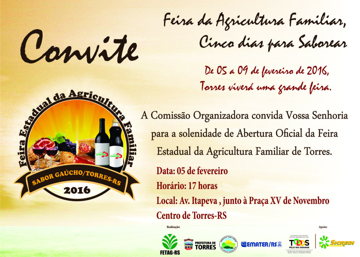 Convite2Não é apenas o carnaval que aguarda milhares de veranistas que deslocam-se para o litoral no próximo final de semana prolongado devido à folia de Momo. Com um salto de 21 para 52 empreendimentos, a 4ª Feira da Agricultura Familiar Sabor Gaúcho acontece em Torres, de 5 a 9 de fevereiro de 2016, das 12h às 24h, na Av. Itapeva, junto à Praça XV de Novembro, no centro da cidade.