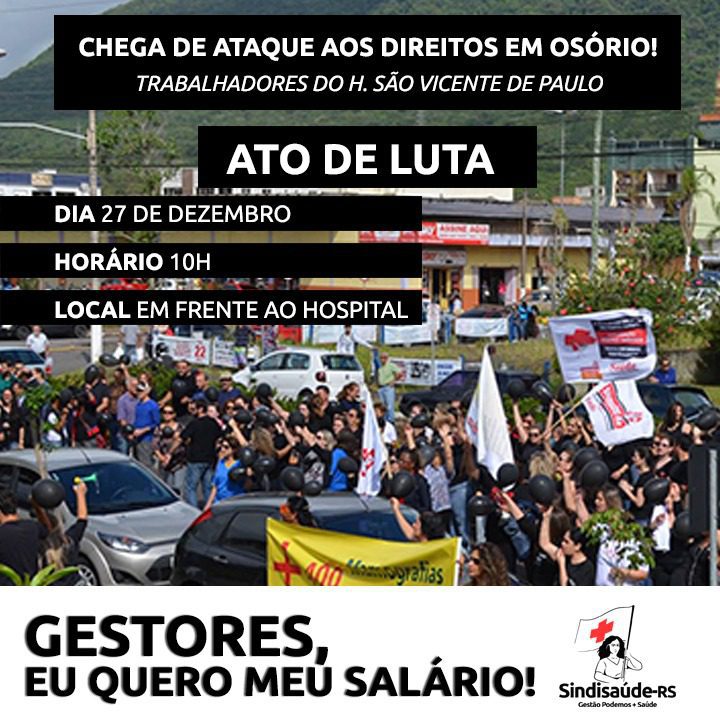 Nesta quarta-feira (27/12), às 10h, os trabalhadores do Hospital São Vicente de Paulo, de Osório, farão um ato em frente a instituição contra o atraso de salários.