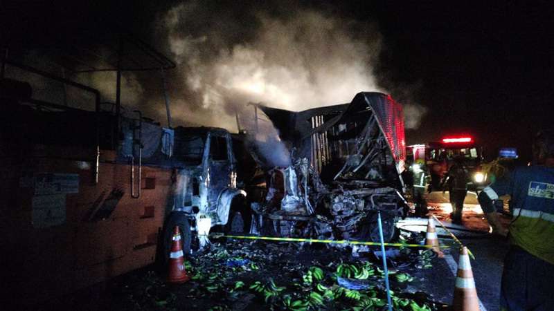 Segundo informações da Polícia Rodoviária Federal, o caminhão, que transportava carga de bananas e tinha placas de Morrinhos do Sul, pegou fogo após a colisão.