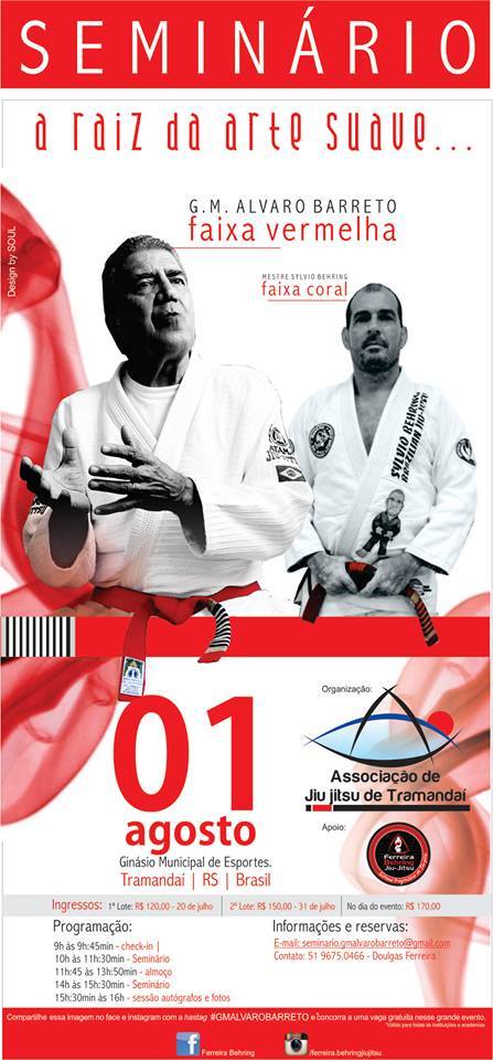 Será realizado neste sábado, dia 1º de Agosto de 2015, no Ginásio de Esportes de Tramandaí, o Seminário Aberto com grandes mestres do jiu-jitsu nacional. Estarão presentes o faixa vermelha Álvaro Barreto e o faixa coral Sylvio Behring, grandes ícones e pioneiros do jiu-jitsu no Brasil.