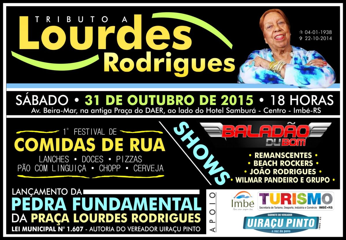 O evento, que terá entrada franca, ocorrerá na praça que leva o nome da cantora. A homenagem foi regulamentada através de Lei Municipal de iniciativa do vereador Uiraçu Pinto (PROS) e denominou o local popularmente conhecido por “Praça do DAER” como “Praça Lourdes Rodrigues”. Na oportunidade será lançada a pedra fundamental da praça, localizada na Avenida Beira-Mar, entre as ruas Taquara e Bento Gonçalves, no Centro de Imbé.
