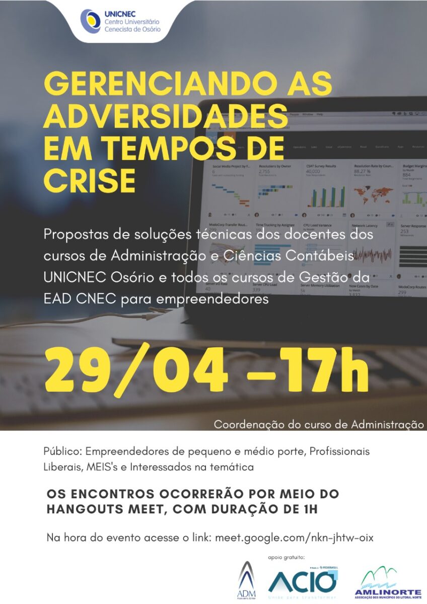 Na próxima quarta-feira, dia 29 de abril, os cursos de graduação em Administração, Ciências contábeis e de gestão do UNICNEC Osório lançam projeto que visa auxiliar os empresários nesta época de crise econômica, através de proposta técnicas do seu corpo docente especializado em gestão administrativa.