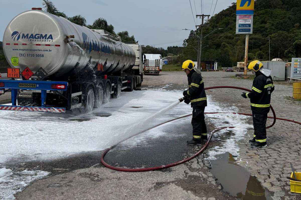 Um vazamento de etanol na BR-101 mobilizou uma grande operação do Corpo de Bombeiros Militar de Santa Catarina (CBMSC) na manhã desta quinta-feira (16), após uma colisão entre dois caminhões na altura do Km 230, sentido Sul, em Palhoça.