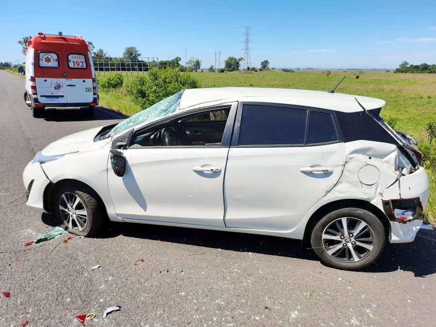 Um veículo Toyota Yaris, conduzido por uma mulher, deslocava no sentido Osório/Xangri-Lá, quando por causas desconhecidas perdeu o controle do carro, vindo a sair da pista e capotar.