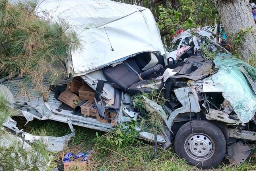 Um veículo Furgão Citroën Jumper ficou destruído após sair da pista e colidir em uma árvore, às margens da RST 101.