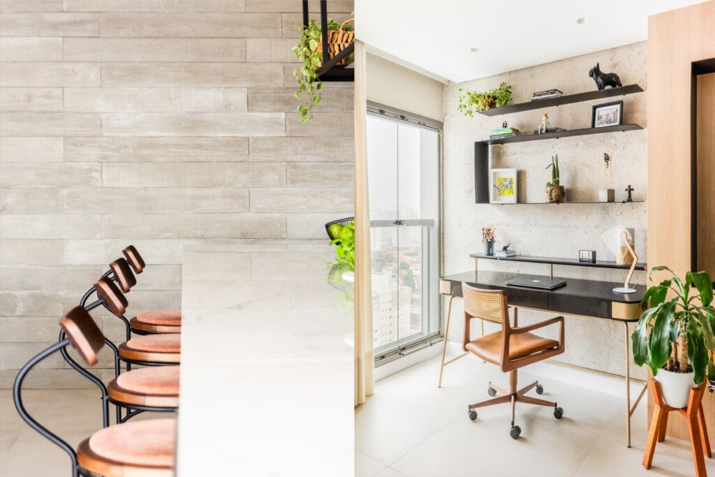 Apesar da aparência semelhante, o concreto aparente, por sua vez, é um elemento estrutural que não recebe camadas de acabamento, deixando a matéria-prima das edificações expostas. Esse revestimento é muito presente em projetos brutalistas e industriais, proporcionando um visual urbano e autêntico. “A superfície do concreto é extremamente resistente e demanda baixa manutenção, sendo ideal para ambientes internos e externos”, completa o arquiteto.