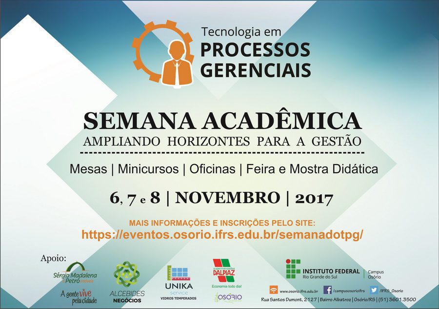 O Campus Osório convida para a Semana Acadêmica do Curso Superior de Tecnologia em Processos Gerenciais, que ocorrerá entre nos dias 6, 7 e 8 de novembro de 2017, das 17h às 22h40min, no Campus, rua Santos Dumont, 2127, bairro Albatroz.
