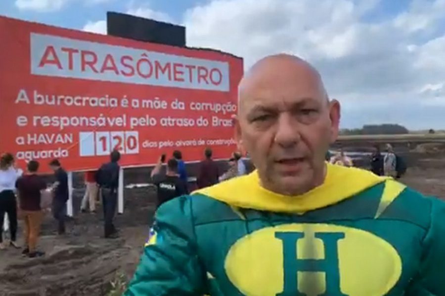 Dono da rede Havan, Luciano Hang se vestiu de super-herói para inaugurar a placa de “atrasômetro” na obra da loja de Capão da Canoa.