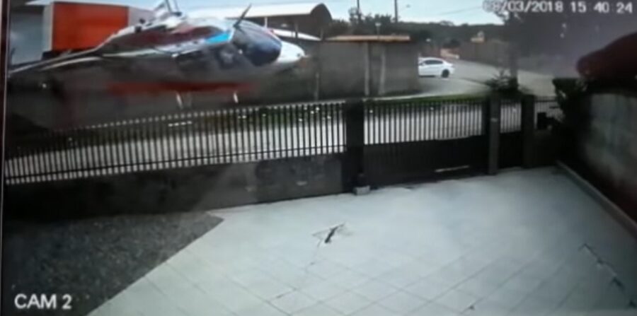 Uma câmera de segurança registrou a queda de um helicóptero em Joinville, Santa Catarina, na tarde de quinta-feira (8).