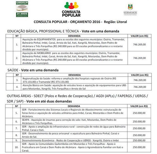 Como acompanhar o resultado da votação: as demandas eleitas serão divulgadas pelos Coredes e estarão no site www.consultapopular.rs.gov.br
